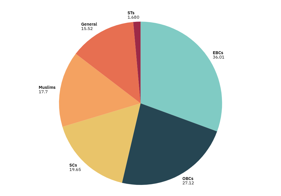 • Muslims (as a religious minority): 17.70% (distributed across various caste categories, including some OBC/EBC groups like Sheikh, Momin, Surjapuri Muslim, Dhuniya, etc.)
